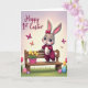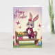The front design shows a young rabbit sitting on a wooden bench, looking outward with big blue eyes and a small, tender smile that feels like a friendly hello 🐰. It wears a deep berry-colored one-piece outfit, with a fluffy white chest, a matching white tail, and a tiny pink bow set between soft gray ears. Behind it, the sky fades from light lavender into a creamy golden tone, like early morning light washing over the scene. Three butterflies in fuchsia and warm coral drift above, adding a light, fluttering motion around the rabbit’s gentle gaze 🐇. On the bench beside the rabbit, a cluster of sunny yellow tulips leans in close, as if sharing the seat. In the upper left, the words “Happy 1st Easter” appear in a flowing, elegant style, set in a dark ink that stands out against the pale sky. Below, lush green grass frames several decorative eggs patterned in pink, blue, and purple near the base of the bench.