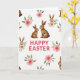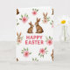 On the front of the card two brown rabbits sit close together at the center, their soft fur shaded in warm tones as they lean in with a tender, friendly gaze 🐰. The larger rabbit tilts its head toward the smaller one, and the smaller rabbit looks back as if sharing a quiet secret. Just beneath them, the words “HAPPY EASTER” appear in large uppercase letters, set in bright magenta and centered near the lower middle. Around the edges, blush-pink flowers and light green leaves form loose clusters that frame the scene without crowding it 🌷. A white background keeps the focus on the pair, making the gentle browns and pastel florals stand out. Near the sides, a few smaller rabbits peek from behind rounded floral rings, adding a soft repeating pattern. The outer border is sprinkled with pink blossoms and leafy sprigs, with tiny rabbits tucked into the corners.
