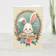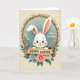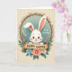 Designed with a stylized white bunny at the center, this card shows it peeking from behind a gently curling golden banner, its sparkling eyes and rosy cheeks giving it a sweet, friendly look 🐰. The bunny’s tall ears are lined in soft pink, tilting slightly as if it’s shyly greeting someone just out of view. A scrolling earthy-brown frame surrounds the scene, adding an old-fashioned touch against a muted teal background. In the upper right, the words “Easter Greetings” appear in small, flowing cursive lettering in a warm brown tone. Beneath the banner, spring flowers spill downward in coral, sky blue, and creamy white, each with a sunny yellow center, suggesting a thoughtful bouquet shared between close friends 🌷. Lush green leaves weave through the blooms, alongside pale pink tulip buds that look like they’re about to open. The whole illustration sits on a textured cream backdrop with a parchment-like look, and the golden banner stretches across the bunny’s chest with the greeting centered on it.
