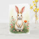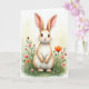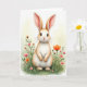 Designed with a sweet spring scene, the card features a young, human-like bunny centered and looking straight ahead with wide brown eyes that feel like a shy, friendly hello 🐰. Creamy white and warm beige fur is shaded to look soft, with long ears rising up and a gentle pink tint inside. Around the bunny, slender green stems and leaves form a close frame, like a bouquet gathered for someone special. Soft pink and coral-orange flowers mingle through the greenery, and tiny red berries dot the foreground like little accents on a gift 🌷. The background fades from pale yellow-green into a light haze, keeping the bunny and blooms in focus under gentle, diffused light. A short Easter greeting sits near the top in a light, easy-to-read pastel tone, with a smaller line of text placed near the bottom in a matching color. The flowers cluster along the sides and lower edge, with the bunny’s face and ears standing clear in the open center space.