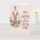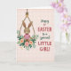 This greeting card features an adorable, humanlike rabbit centered on a flower-wrapped swing, giving a gentle, friendly feel 🐰. The rabbit has soft brown fur, dark eyes, and rosy cheeks, and its calm gaze feels like it’s meant for someone close. It wears a white-and-deep-rose striped top, adding a cozy touch against the spring palette. Around the swing is a garland of peach and blush blossoms with green leaves and tiny berry accents, arranged like a tender frame. The background is a muted pink grid that adds light texture without pulling attention from the main figure. On the right side, a celebratory message is placed in two contrasting letter styles, with the main words in deeper pink and smaller supporting words in a lighter tone 🌷. Braided rope lines form the swing supports, and the petals show soft shading and rounded edges.