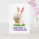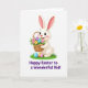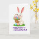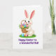 This greeting card features a stylized bunny in soft cream tones standing at the center on a small patch of green grass 🐰. Its tall ears are lined with pink, and its wide dark eyes and rosy cheeks pair with an open smile that feels like it’s meant for someone close. The bunny holds a woven basket at chest height, as if offering it with a gentle, friendly eagerness. The basket is filled with a bouquet of flowers in pink, purple, yellow, and blue, creating a springtime look 🌷. Behind everything is a bright white background with even lighting that keeps the focus on the bunny and its gift-like pose. Along the bottom edge, a purple line of text reads “Happy Easter to a Wonderful Kid!” and sits centered beneath the character. In the grass near the bunny’s feet are three pastel eggs decorated with stripes and polka dots.