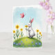 This card shows a soft white bunny 🐰 standing on a gentle green hill, holding a bright yellow flower close to its pink nose as if savoring it with quiet affection. Its long ears tilt slightly back with rosy tips, and its small whiskers and blushing cheeks give it a tender, friendly look. A tiny red-winged insect floats above, adding a hint of shared curiosity in the calm scene. The sky is washed in pale blue with airy white clouds, like a mild spring afternoon. Along the lower edge, tall yellow flowers with dark centers rise among scattered smaller blooms in periwinkle and lavender 🌷. The greeting text sits near the top in a soft, light color that stands out gently against the sky. The bunny’s coat is highlighted with a warm glow, and the hillside is dotted with layered greens and yellow petals in the foreground.