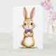 This card features a friendly, upright bunny 🐰 centered on a white background, drawn with light brown fur and a creamy belly that feels soft to the eye. Its big dark eyes shine with tiny highlights, and the rosy cheeks and small pink nose give it a sweet, approachable look, like it’s meeting someone special. A wide smile shows two little front teeth, while the long ears rise up with pale pink inner fur, adding an attentive, affectionate pose. The front paws are held together neatly, suggesting shy excitement, as if it’s waiting to greet a close friend. A rich purple bow tie sits at the neck, adding a dressed-up touch that hints at a date or a warm get-together. Near the lower area, a short line of greeting text appears in a soft purple tone, positioned just above a few scattered green grass blades 🌷. The grass sits along the bottom edge in small emerald strokes beneath the bunny’s feet.