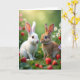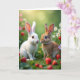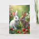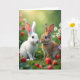 Designed with two young rabbits facing each other in a grassy clearing, the scene focuses on their gentle closeness as their noses nearly meet 🐰. One rabbit is bright white and the other is tawny brown, and their round dark eyes hold a tender, unspoken connection. Around their paws, red strawberries are scattered across deep green grass, adding small pops of color in the foreground. Soft golden light pours in from the upper background, filtering through leaves and forming a blurred, glowing backdrop that keeps attention on their faces. Their fur looks plush and detailed, with fine whiskers and slightly rosy, translucent ears catching the light. Pastel wildflowers peek through the grass like tiny accents, giving the setting a calm, garden-like feel 🌷. The greeting appears near the top in a light, spring-like color, with a smaller line of text placed below in a softer shade. In the distance, the foliage fades into gentle circles of light behind the rabbits.