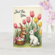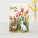 Designed with two gentle rabbit figures as the main focus, one in warm russet fur and the other in soft white, standing close on a green patch of grass 🐇. Their heads tilt toward each other and their calm, curious eyes meet, suggesting a sweet exchange between friends. Around them, pink and golden tulip-like flowers rise on slender green stems, framing the pair against a creamy, light-filled background 🌷. A woven basket sits near the russet rabbit, filled with smooth pastel eggs and finished with a small pink ribbon that feels like a quiet gift being offered. In the upper left corner, the words “Just For You.” appear in a neat, flowing style in dark ink that stands out gently against the pale sky. Soft shading defines the fur, with a faint blush inside each ear and subtle highlights that give the coats a plush look. The flower petals show a slight sheen, and the basket’s weave is drawn with fine lines beside the clustered eggs on the grass. Please enjoy sharing Easter sentiments.