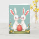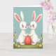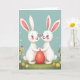 This card shows two cute, human-like bunnies with soft white fur and long ears tipped with pale pink inside, facing each other as if sharing a private joke 🐰. They lean in close with wide smiles, rosy cheeks, bright eyes, and tiny whiskers, giving their pose a cozy, affectionate feel. Between them sits a large red egg-shaped object dotted with lighter round spots, and each bunny holds it gently with their front paws like a shared treasure. The background is a calm pale teal, fading down into a fresh green meadow that frames the pair like a springtime scene. Small flowers are scattered through the grass, including white star-shaped blooms and yellow daisy-like blossoms with warm orange centers 🌷. A few slim stems carry little red berries, adding extra pops of color around their feet. The lighting looks soft and even, with smooth shading that outlines their tails and adds delicate shadows under their paws. No text appears on the front, leaving the teal sky area open above the bunnies and the red dotted egg centered between them.