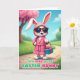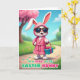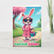 This card shows a cheerful, human-like bunny standing confidently on a sunlit, winding paved path 🐰. The bunny wears a cozy pink hooded robe tied at the waist and dark sunglasses, with long ears poking up through the hood for a flirty, friendly look. In one paw, it holds a small teal gift box wrapped neatly with a bright pink bow, like it’s about to surprise someone special. Behind it, a large tree is covered in fluffy pink blossoms against a clear blue sky with a few soft white clouds 🌷. Green grass lines the path, dotted with colorful round treats that add a fun, festive touch. Along the bottom, the message “TO A HUNNY OF AN EASTER BUNNY” is printed in two tones, with the main words in a darker shade and the rest in a lighter accent. The teal box sits near the bunny’s side, its pink bow sharply outlined against the robe and the pastel spring background.