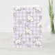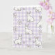 This greeting card features a repeating pattern of white bunnies outlined in soft gray, scattered across a lavender-and-white gingham background that feels calm and springlike 🐰. Each bunny has dark, attentive eyes and pale pink inner ears, and their gentle poses—some sitting close as if sharing a quiet moment, others stretching forward with curious energy—add a tender, friendly tone. The pastel checks create a cozy setting, like a picnic cloth laid out in early spring light. Small five-petal flowers in blush pink with tiny purple centers appear between the bunnies, adding little hints of romance in the way they frame pairs and clusters 🌷. The lighting looks softly diffused, giving the whole design a smooth, airy glow without sharp shadows. There is no visible text on the front, leaving the illustration to fill the space from edge to edge. White bunnies with gray outlines and pink ears repeat across the lavender gingham, with blush flowers dotted in the gaps.