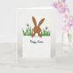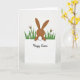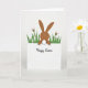 This card shows a brown bunny with long upright ears and a fluffy white tail, peeking over a bright green strip of cutout grass as if it’s shyly saying hello 🐰. The scene sits on a smooth white background that keeps the shapes and paper-like layers easy to notice. Two small pink flowers with simple green stems rise from the grass near the bunny, like a little garden corner 🌷. The bunny’s gentle peek and the close placement of the blossoms give the layout a friendly, affectionate feel, like a quiet shared moment. The greeting “Happy Easter” appears in black, flowing lettering across the lower part of the white area, centered beneath the grass. The colors stay soft and springlike, with fresh green against warm brown and light pink accents. The green grass edge runs straight across the upper portion of the card, while the bunny’s ears extend slightly above it and the pink flowers sit to one side.