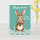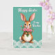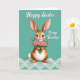 This card features a sweet, human-like bunny with russet-brown and creamy-white fur, standing against a muted teal background that feels like a calm spring sky 🐰. The bunny’s large dark eyes and gentle smile, with two front teeth showing, give it a friendly, affectionate look as if it’s offering a quiet hello to someone special. In its paws is a bouquet of lush pink roses with rich green leaves, held close in a way that suggests a tender gift between friends or a soft romantic gesture 🌷. The lighting is diffused and soft, adding a slight sheen to the rose petals and a cozy softness to the fur. A short holiday greeting appears near the top in white lettering, centered above the bunny so it reads clearly against the teal. Fine texture and shading add depth along the upright ears and around the cheeks without feeling heavy. Along the bottom edge, an intricate white lace-like pattern forms a decorative band that frames the scene.
