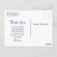 A party thank you postcard decorated with an illustration created with watercolors. A cute bunny rabbit wearing a blue dress sitting in a basket surrounded by her eggs. Butterflies flutter around the basket which is decorated with a fancy flower bouquet. Peach and white striped background. Personalized message on the back.