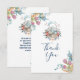 Party thank you card. Small rsvp sized card. Designed with an illustration created with watercolors. A cute momma bunny dressed in blue sitting in a basket surrounded by eggs. Butterflies and flowers around the basket. Tulip floral bouquets in the corners.