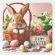 cute brown bunny in an easter basket surrounded with flowers and easter eggs