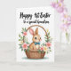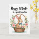 Designed with a sweet spring scene, this illustration shows a small brown bunny with bright blue eyes sitting snugly in a woven basket, wearing a turquoise bow tie and a gentle smile that suggests a fond, friendly bond 🐰. The basket is drawn with detailed wicker texture and a braided handle arching above the bunny’s head. Pink and yellow flowers curl around the basket like a soft embrace, with fresh green leaves and tiny sprigs filling in the edges 🌷. A single golden-yellow bloom rises near the rim on a slender stem, adding a light, airy accent. The background stays white and open, making the bunny and florals stand out clearly. Near the top, the message “Happy 1st Easter to a special Grandson” is centered in a flowing, cursive-style font, shown in a darker ink that contrasts against the pale backdrop. The colors blend gently with a watercolor-like look, giving the fur, petals, and basket shading a smooth, tender finish. The bunny’s turquoise bow tie sits neatly under its chin, and the basket’s handle curves upward in a soft arc above the floral border.
