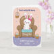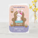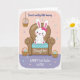 Designed with a sweet spring scene, this card features a white cartoon bunny 🐰 with pink inner ears, a tiny pink nose, rosy cheeks, and a small bow, lounging in a cozy brown armchair with a light blue cushion. The bunny’s relaxed pose and gentle smile create a tender, friendly mood, like it’s quietly enjoying someone’s company. Behind it, the background fades from blush pink into soft lavender, with scattered little flowers and round dots drifting across the space like confetti 🌷. Three woven baskets filled with pastel eggs in pink, blue, and green add a festive touch, with one basket hanging near the upper left and two more placed around the chair. A few short lines of text appear around the illustration, set in thin cursive-style lettering in soft pink and lavender tones. The words are positioned to balance the scene, with one phrase near the top area and another closer to the chair, guiding the eye without crowding the artwork. The armchair’s rounded arms and the bunny’s pink paw pads are drawn with smooth shading, and the eggs in the baskets show small highlights against the pastel gradient backdrop.