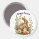 Sweet, vintage picture of a bunny in flowers with a colored egg, is featured on this round magnet for Easter. With message, "Happy Easter", this magnet can be used to decorate for the Easter holiday. Or give it as a small gift too!