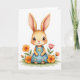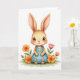 This card shows a fawn-colored bunny standing front and center on a white background, looking straight ahead with wide brown eyes, fine lashes, and softly blushed cheeks. Its long upright ears and small pink nose sit above a gentle smile, giving the pose a friendly, almost flirty sweetness 🐰. The bunny wears a sky-blue pinafore dress with a yellow daisy on the chest and tiny pink and red flower shapes scattered across the skirt. Around its feet, bright green grass spreads out like a little garden stage, with its fluffy white tail peeking from behind. Clusters of orange four-petal flowers and a single pink bloom lean inward from the sides, as if they’re crowding close to keep the bunny company 🌷. Soft, even lighting adds a smooth glow with no sharp shadows, making the colors look tender and calm. The greeting sits near the top in sky-blue lettering, with a smaller line beneath it in light pink, and the orange flowers show layered petals with green leaves and small buds curling upward.
