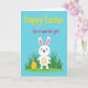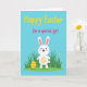 This card features a stylized white bunny with soft pink inner ears, rosy cheeks, and simple dot-and-line features that give it a gentle, friendly look 🐰. It sits low on lush green grass sprinkled with tiny yellow flowers, as if pausing to share a quiet moment with whoever is reading. Behind it stretches a wide aqua-blue sky, keeping the scene airy and calm while the bunny’s slight tilt feels like a shy hello. Across the top, a hand-lettered headline curves overhead, with the main line in bright yellow and a smaller dedication beneath it in magenta, centered above the character. To the bunny’s left, nestled in the grass, an egg-shaped decoration shows alternating yellow and deep orange stripes, adding a cozy seasonal touch 🌷. Thin yellow borders run along the top and bottom edges, framing the picture without crowding it. The overall palette stays light and springlike, with the bunny placed slightly right of center and the striped egg balancing the left side. The yellow headline sits above the magenta line, both floating against the aqua sky.