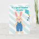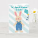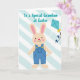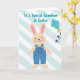 Designed with a sweet spring scene, this card features an upright bunny character 🐰 placed front and center with soft pink inner ears, dot-like eyes, a small pink nose, and a gentle smile warmed by rosy cheeks. The bunny wears blue overalls with sunny yellow buttons and dashed stitch details, giving it a cozy, friend-to-friend feel, like it’s dressed up to meet someone special. Behind it, pale blue and white diagonal stripes suggest a bright morning sky, keeping the setting light and airy. In the upper right area, a turquoise kite tilts as if caught by a breeze, hinting at a shared day outdoors. The kite is finished with a yellow bow where the tail begins, followed by two smaller dark blue bows that trail downward. A short holiday greeting appears near the top in rounded teal lettering, spaced so it doesn’t crowd the character. Small touches of soft pink, light blue, and creamy neutral tones tie everything together, and a single 🌷 accent can sit near the lower edge beside the bunny’s feet.