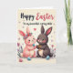 This card shows two rabbit-like characters centered on a soft cream background with small floating hearts, setting a sweet, close moment 🐰. The left character is pale pink and wears a rose flower crown with a tiny blue bow, turning toward the other with a tender, affectionate gaze. Beside it, a dark brown companion holds a shiny golden cross near its chest, adding a gentle note of celebration. Their hands reach toward each other and nearly meet, like a quiet promise between friends or partners. Along the bottom, pastel eggs and simple spring flowers cluster around their feet, with soft light washing the scene. A short message sits near the top in flowing lettering, printed in a darker tone that stands out against the pale background 🌷. The characters look softly rounded, while the hearts, eggs, and plants are drawn with sharper outlines for contrast. The golden cross catches the light with a small highlight along its upper edge.