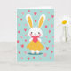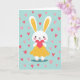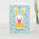 This card features a stylized white bunny holding a ruby-red heart close to its chest, with a tender, affectionate pose that reads like a quiet hug 🐰. Its long ears have sunny yellow inner panels sprinkled with small white dots, framing a rounded face with dark, shining eyes and a soft pink blush. A tiny upturned mouth adds a gentle, friendly look, like it’s sharing a private, caring moment with the viewer. The bunny wears a mustard-yellow dress dotted in white, giving the character a sweet, cozy look suited to romance or close friendship. Centered near the top, simple lettering in a warm pink tone stands out clearly against the background. The setting is a soft blue-green field that keeps the scene calm and airy, letting the heart and facial details draw attention. Floating around the bunny are scattered hearts in different sizes, mixing warm pinks and deeper reds, with a few clustered near the upper corners 🌷.