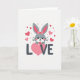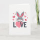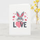 This greeting card shows a cute gray bunny sitting on top of a large pink heart, with pink inner ears and rosy cheeks. The bunny has wide eyes and a happy face, and it wears a small pink bow with a tiny red flower on one ear, plus another little flower near its chest. Across the middle, the card spells out “LOVE” in dark gray letters, and the pink heart acts as the “O.” The background is white with soft shadows that make the bunny, letters, and heart look slightly layered. Small pink hearts and tiny red dots are scattered around like confetti, filling the space with a sweet, loving feel 💘. The simple pink and gray colors keep the focus on the bunny and the message, making it easy to read and enjoy ❤️. It’s a sweet pick for a partner, friend, or anyone you want to make smile 😘.