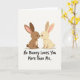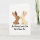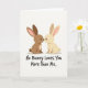The front design shows two cartoon rabbits sitting nose-to-nose in the middle of a white background, their faces close as if sharing a shy, affectionate moment 🐰. One rabbit is warm brown and the other is a soft cream color, and the gentle contrast makes them feel like a sweet pair. Both have big, bright eyes and light pink blush on their cheeks, with tall ears showing pale pink on the inside. Their rounded shapes and soft edges add to the friendly look, and the tiny space between their noses suggests a tender pause. A faint gray shadow sits under them so they feel grounded without adding clutter. Centered below the illustration, a short line of text appears in a casual handwritten look in dark lettering, reading, “No Bunny Loves You More Than Me..” 🐇. The rabbits’ ears tilt slightly upward, and the blush spots sit just beneath their eyes in small rosy circles.