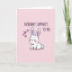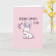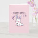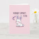 This card features a bright white bunny character 🐰 centered on a soft fuchsia blush background, standing calmly as if saving a sweet thought for someone special. Its eyes are closed with a small, content smile, and light pink blush on the cheeks hints at a shy, affectionate moment. Long ears rise above its head with pale lavender inner coloring, adding a gentle contrast to the warm backdrop. Three small purple hearts float to the left of the bunny’s head, like quiet signals of friendship or romance drifting in the air 🌷. A neatly tied crimson bow sits at the neck, giving the character a dressed-up look that feels tender rather than formal. Above the bunny, a short pun-style phrase appears in a dark purple, casual handwritten-style font, centered near the top with plenty of open space around it. The overall layout stays simple and airy so the bunny and the message feel closely connected. The purple hearts sit just left of the bunny’s ear line, spaced evenly against the pink background.