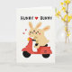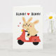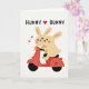 This card shows two simplified bunny-like animals riding close together on a small motor scooter 🐰. The background is plain white, keeping all attention on the pair and their cozy, side-by-side pose. Both characters are a creamy beige with light pink cheeks and tiny dot eyes, and one leans its head against the other as if enjoying a quiet, affectionate moment. A few small red hearts float near them, adding a gentle romantic note without crowding the scene 🌷. The scooter is coral-red with a round yellow headlight at the front and dark wheels underneath, drawn with minimal detail. Centered above the illustration, the words “HUNNY ❤️ BUNNY” appear in uppercase letters in a dark tone, with a red heart symbol between the two words. The coral scooter body contrasts with the white background, and the yellow headlight sits like a bright circle near the front fork.