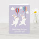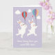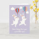 This greeting card features a soft pastel illustration of two stylized white rabbits floating side by side, their long ears tipped with warm orange and their cheeks tinted pink for a tender, friendly look 🐰. Each rabbit has tiny black dot eyes and a small curved smile, and their close spacing suggests they’re sharing the same gentle moment in the sky. The rabbit on the left holds a round balloon divided into red and turquoise sections, each section dotted with small white polka dots. The rabbit on the right holds a balloon segmented in turquoise, lavender, pink, and yellow with dotted patterns, and a small red heart drifts nearby as if following them 🐇. Behind them is a lavender sky with fluffy white clouds and scattered little white stars, giving the scene a calm, dreamy setting. Near the bottom, the message “Some bunny loves you, sweet little twins” appears in white cursive-style lettering, centered beneath the rabbits. The overall look uses flat, layered shapes and smooth outlines, keeping the focus on the pair and their shared, affectionate gaze. The balloons’ thin strings curve upward toward their paws, and the tiny white stars are sprinkled around the clouds.