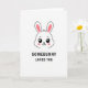 This card features a stylized bunny head centered on a stark white background, keeping the focus on its soft, rounded face 🐰. Simple black outlines shape the ears and cheeks, while large black eyes with tiny white highlights and fine lashes give it a tender, affectionate look, like it’s gazing at someone it trusts. A faint rosy blush warms the cheeks, matching the pale pink inside the ears for a gentle, friendly touch 🌷. Beneath the illustration, the phrase “SOMEBUNNY LOVES YOU” sits centered in thick, sans-serif lettering. The text is black, spaced evenly, and placed low enough to feel like a quiet note left under the bunny’s chin. The open white space around the design makes the little face and message feel close and intimate, like a small romantic wink or a sweet nudge between friends. The bunny’s rounded muzzle, pink inner ears, and centered black message stand out crisply against the white background.