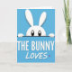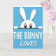 This card features a simple digital illustration of a white bunny peeking over a straight horizontal edge, set against a wide cerulean-blue background 🐰. Only the bunny’s head and rounded paws are visible, with soft shading that gives the white shape a slightly raised look. Its large oval black eyes include tiny white highlights, creating a sweet, attentive gaze that feels like it’s looking at someone it trusts. The open blue space keeps the scene airy and calm, like a quiet moment shared between friends. Beneath the dividing line, the text “THE BUNNY” appears in uppercase white letters, centered and easy to read. Just below that, the word “LOVES” is written in a looser, flowing style, also in white, and it’s accented by a small magenta heart 🌷. The blue background stays solid and uninterrupted, while the bunny’s bright white outline and the magenta heart stand out sharply against it.