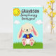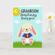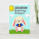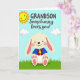 This card shows a friendly, human-like rabbit 🐰 sitting near the lower center, colored soft cream with pink inside its long ears and on its paw pads. Rosy cheeks and a small smile give it a sweet, affectionate look, like it’s posing for someone it cares about. The rabbit wears a bright blue shirt with a deep red vest and a sunny yellow tie, adding a dressed-up touch that feels warm and close. Above, a pastel blue sky stretches across the top with puffy white clouds, and a smiling golden sun sits in the top-left corner. A green strip of grass runs along the bottom edge, setting the scene outdoors in springtime. The message is placed above the rabbit, with “GRANDSON” in uppercase lettering and “Somebunny loves you!” in a more flowing style, both in dark lettering that stands out against the sky 🌷. The sun’s face is simple and cheerful, with short rays extending outward into the blue sky.