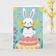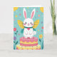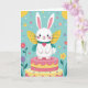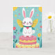 This design shows a white bunny figure perched on a two-tier cake, smiling with rosy cheeks and tall upright ears 🐰. A small teal collar circles its neck, centered with a bright pink heart that reads like a sweet gift for a close friend. Soft golden-yellow wings peek from behind, adding a gentle, affectionate touch as if the bunny is there to surprise someone special. The cake layers alternate pink and sunny yellow with scalloped edges, dotted with blue and purple circles like sprinkled confetti. Behind it, a sky-blue background is scattered with simple flower shapes in pink, yellow, and purple, giving the scene a light garden-party feel 🌷. Small white and purple round accents float around the cake and bunny, like little bubbles or dew drops. The main greeting text sits near the top in white, with a smaller line beneath it in purple. The bunny’s heart charm is bright pink, centered on the teal collar, and the cake is topped with a neat pink border.