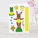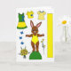 This card shows a friendly bunny character in warm brown tones with bright blue eyes and a wide grin, standing on a rounded green hill in a sunny yellow outfit with arms open as if welcoming a hug 🐰. Around the bunny, several outfit pieces are arranged like a little dress-up scene, suggesting a sweet, companionable moment where someone might be helping choose what to wear. On the left sits a green sleeveless top decorated with blue flower shapes, paired with a yellow skirt that flares outward. Nearby are two yellow tops, one with a ruffled neckline and a single blue flower accent, and another with soft white stripes and a blue-trimmed collar. The background stays white and airy, with three blue butterflies floating around the scene like they’re drifting between friends 🐇. Along the bottom, a cluster of yellow daisy-like flowers and a few single blossoms add a gentle springtime touch, as if set out for someone special. A tall vertical yellow strip runs down the right edge, and there is no visible text, leaving the illustration to carry the message through color and placement.