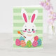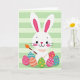 This card features a bright white bunny with rosy cheeks and pink-lined ears, centered with a wide smile and friendly eyes that seem to meet yours like an old pal 🐰. In one paw, the bunny holds a thin paintbrush tipped in orange, as if it’s finishing a special detail just for someone close. Clustered around its feet are decorated eggs in teal, deep pink, and leafy green, arranged like a small shared treasure pile between friends 🌷. The eggs show stripes in fuchsia and coral, zigzags, polka dots, and tiny gold stars that look carefully placed with patient attention. A short Easter greeting sits near the top in a soft pink tone, spaced neatly so it doesn’t crowd the illustration. The background stays gentle with light and slightly darker pastel green stripes, giving the scene a calm setting that keeps the focus on the bunny and eggs. A few eggs near the front have teal bases with gold stars, while others alternate coral-and-fuchsia bands beside green eggs dotted in pink.