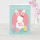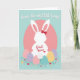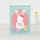 Designed with soft pastel tones, the card features a white bunny seen from behind, set inside a large pastel pink oval on a mint green background 🐰. The bunny’s long ears have pink polka-dotted inner sections, and a small red bow with white spots sits near the top, giving it a sweet, friendly look. A dotted fluffy tail and a gentle curve to the bunny’s posture suggest a shy, affectionate moment, as if it’s turning toward someone just out of view. At the bottom, five speckled eggs in lavender, baby pink, light turquoise, and sunny yellow cluster together like a little shared celebration 🌷. Small hearts in red, white, and pale pastel shades are scattered across the lower area, adding a tender, close-to-the-heart touch between friends or sweethearts. Near the top, a short line of white lettering sits over the pink oval, while a second message appears in red across the bunny’s back with a tiny heart underneath. The eggs show fine white speckles, and the hearts vary in size across the lower foreground.
