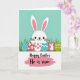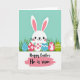 This card shows a spring celebration scene with a plump white bunny peeking from behind a strip of green grass, its upright ears lined in pink and its face drawn with dot eyes and a small smile 🐰. The bunny’s gentle, inviting look feels like a friendly hello, as if it’s leaning in to share the moment with someone close. The background is a soft mint green that keeps the mood light and airy. Across the lower middle sits a neat row of six decorated egg shapes in bright pinks, blues, and lime green, adding a cheerful band of color. One egg has white polka dots on sky blue, another is fuchsia with small white flowers, and another shows a small bunny silhouette that echoes the main character 🐇. Near the bottom, a white panel holds the greeting text in a flowing dark style, with a rosy brushstroke underline that adds a tender accent. The grass line is a simple green curve, and the eggs are arranged evenly in a straight horizontal line above the white text area.