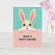This card shows a sweet, human-like bunny centered on the front, peeking over a wide horizontal edge as if leaning in for a friendly hello 🐰. A thin dividing line runs across the design, with a teal-blue background above and a blush-pink panel below. The bunny is a soft cream color with large black eyes and tiny lashes that give it a tender, attentive look, like it’s meeting someone’s gaze. Long upright ears stretch into the upper area, each with a gentle pink inner section, adding height and a soft, affectionate mood. A rosy nose, faint pink cheeks, and fine dark whiskers warm up the face, while a small open mouth shows a touch of red. Two rounded paws rest on the top of the pink panel, as if it’s carefully holding on while leaning closer 🌷. Across the lower pink area, a dark greeting line sits centered in thick lettering, standing out clearly beneath the bunny’s paws.