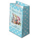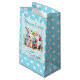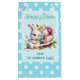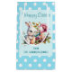 This is a cute Easter gift bag featuring a watercolor image of a bunny, Easter eggs and flowers, with a blue and white polka dot border. The text on the bag is customizable with your own.