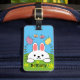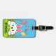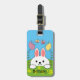 Adorable white cartoon bunny rabbit poking his head out of his bunny hole. he is surrounded by green grass and lots of pretty colorful flowers. Above his head are two bright butterflies fluttering about in the clear blue spring sky. Templates on the front and back to add your name and details.