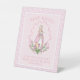 Cute pink bunny rabbits table top pedestal sign to display on your baby shower table to Baby Kisses game. Soft pink pastel gingham background. Bunny rabbit in a pink ribbon frame with accent tulips. Just as sweet as can be for a baby shower game and this pedestal adds another decorative piece of festivity to any event table.