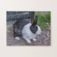 A close up photograph of a black and white rabbit printed on a puzzle.
