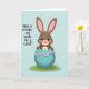 This card features an adorable, human-like bunny peeking out from a cracked turquoise eggshell 🐰. The bunny’s large dark eyes and rosy cheeks give it a tender, friendly look, as if it’s sharing a private joke with whoever’s holding the card. Its long ears have soft pink inner shading, and its brown fur is dotted with lighter spots that add gentle texture. The eggshell is decorated with a wavy bubblegum-pink stripe and scattered pink circles, making the shell feel festive without being busy. A small tuft of green grass sits beneath the shell with a soft shadow, grounding the scene in a simple spring setting 🌷. On the left side, the riddle text “What is invisible, and smells like a carrot?” appears in a friendly, easy-to-read style in dark lettering against the pale background. The background stays a smooth, pale sky-blue, letting the bunny and egg colors stand out clearly.