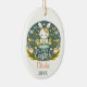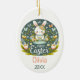 This charming Easter ornament features a whimsical design with a cute bunny seated amidst a vibrant garden of spring flowers and foliage. The dark background contrasts beautifully with the pastel colors of the flowers and the light, cheerful bunny, enhancing the festive and joyful feel of the piece. The text "My First Easter" arches above the bunny, signifying a child's inaugural Easter celebration, with a customizable name area at the bottom, here shown as "Olivia", which can be personalized to include any name. The year "20XX" is also customizable, allowing for a special date marking. The ornament, likely made of ceramic, has a glossy finish and comes with a golden string for easy display, making it a perfect keepsake to commemorate a child's first Easter holiday.