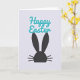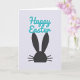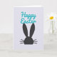 This design shows a jet-black silhouette of a long-eared bunny face 🐰 centered in the lower two-thirds of the card, with tall pointed ears, a rounded head, and three short whisker lines on each side. The background is a cool, bright white that gives the dark shape lots of breathing room and a modern look. Above the bunny, a short Easter greeting sits near the top center in smooth, flowing lettering. The letters are a bright teal-turquoise that feels slightly raised, with a faint shadow that adds depth without clutter. The simple contrast of black, teal, and white keeps the scene calm while still feeling festive 🌷. The spacing between the greeting and the bunny creates a gentle, affectionate pause, like a quiet exchange between friends. The bunny’s ears reach upward toward the teal words, with crisp edges and a soft shadow along the lettering.