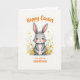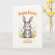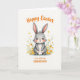 Designed with a sweet, upright bunny at the center, this card shows a soft gray rabbit with a white belly and a fluffy tail, looking forward with wide eyes and a slightly open smile 🐰. Its tall ears have pale pink inner shading that matches the gentle blush on its cheeks, giving it the look of a shy friend leaning in for a photo. The bunny sits among thin green stems dotted with small yellow and orange flowers, like a spring meadow gathered into a loose frame. The white background leaves lots of open space, making the rabbit and flowers feel airy and close, as if they’re sharing a quiet moment together 🌷. Across the top, a short Easter greeting appears in warm orange lettering, centered above the bunny. A smaller line of matching orange text sits below the rabbit, aligned near the middle to balance the layout. Fine whiskers, soft watercolor-like shading, and tiny petal details stand out against the bright white backdrop. The yellow blossoms cluster near the lower sides while a few orange flowers peek out beside the bunny’s cheeks.