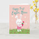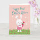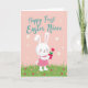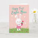 This card shows a stylized white rabbit with long ears, rosy cheeks, and a gentle, welcoming look, as if sharing a sweet moment with someone special 🐰. The rabbit wears a pink dress with small white polka dots, and a fluffy tail peeks out just behind. In its paws, it holds a small pot with a single red flower, offered forward like a quiet sign of affection and springtime friendship 🌷. The background is a soft pastel pink, dotted with tiny white blossoms that float like little petals in the air. Along the bottom, a wide strip of green grass adds texture and a grounded scene. Small wildflowers in pinks and reds are scattered through the grass, with a few pale green accents mixed in. Near the top, a holiday greeting appears in teal lettering, centered against the pink sky. The teal text sits above the rabbit’s ears while the red flower stands out sharply against the pale pink backdrop.