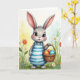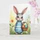 This design shows a gray-furred rabbit centered on the front, with bright blue eyes and rosy cheeks that look warmly toward the viewer 🐰. It wears a blue-and-white striped pinafore, and the gentle tilt of its head gives the scene a friendly, almost affectionate tone. In its paws is a woven basket filled with decorated eggs in orange, red, and blue, each marked with simple contrasting bands. Soft, diffused light washes over a grassy field, setting a calm springtime mood that feels like a quiet moment shared with someone close 🌷. Behind the rabbit, the background blends into green grass dotted with white daisies and scattered orange and pink flowers. The greeting text sits along the upper portion of the card in a light blue color, leaving the artwork open and airy below. The basket’s textured weave and the eggs’ bright patterns stand out against the smooth, watercolor-like greens and floral shapes in the distance.